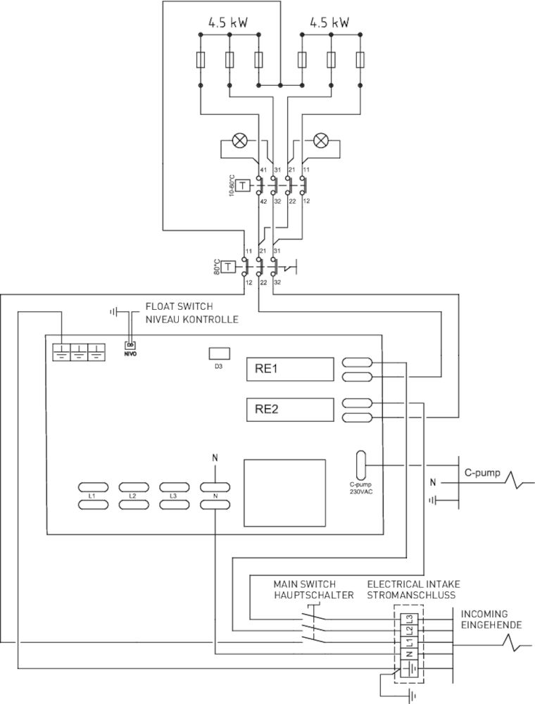 Current: 9 kW: 16 A, 22 kW: 32 A, 42 kW: 63 A Fuse: 9 kW: 3x16 A, 22 kW: 3x32 A, 42 kW: 3x63 A Operating thermostat: Max 60 ºC Safety thermostat: 80 ºC Expansion tank: 12 l Safety valve: 9 kW: 1,5 bar, 22 & 42 kW: 3 bar Boiler volume: 9 kW: 2 l, 22 & 42 kW: 18 l  |